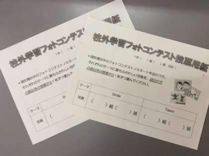 *本日の終学活で、先日行われた校外学習の課題の一つである「フォトコンテスト」の投票が行われました。実行委員が考えた「Smile」と「Team」のテーマにそった写真を各班から一枚ずつノミネートし、最もふさわしいものに投票をします。今回のフォトコンテストに当たっては、先週の放課後、実行委員のみなさんが残って掲示作業をしてくれました。最優秀作品はどの班の写真になるのでしょうか?後日の表彰を楽しみにしていてください!
