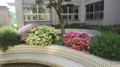 職員室前の廊下から下を見ると、こんなにきれいな風景が広がってます。
