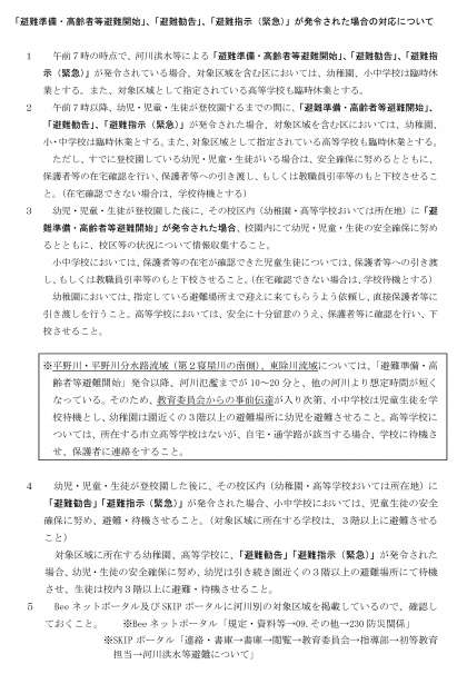 本日から明日にかけて、大雨の影響で河川の増水が見込まれることから、明日から週明けにかけて、避難にかかわる発令があった場合は、次のような対応となりますのでお知りおきくださいますようお願いいたします。