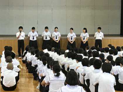 *本日、2年生は定例の学年集会がありました。今日は先生方からの講話に代わり、国語科で実施した「一分間スピーチ」優秀者の発表がありました。昨年から実施している「一分間スピーチ」ですが、今年のテーマは「私が好きな/大切にしている言葉」でした。各クラスの投票で選ばれた7名の発表者が、「初心忘るべからず」「人は見かけによらぬもの」など、思い思いの言葉を自身の経験をもとに発表してくれました。中には、ユーモアを交えつつも、お腹いっぱいに食べられることは幸せである一方、世界ではお腹いっぱいに食べることができない人々もいる現実について指摘する内容もありました。聞いている人たちが考えさせられる一分間の連続であったように思います。発表者のみなさん、お疲れ様でした。