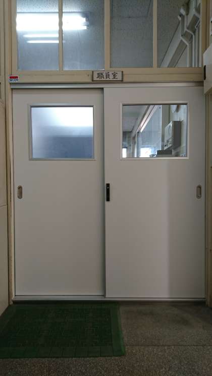 傷みや破損がひどくなっていた職員室の前扉取替を行いました。