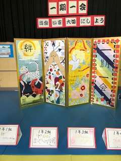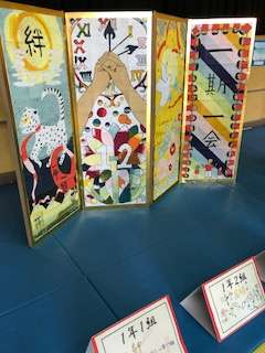 クラスごとに考えたデザインをちぎり絵で屏風に仕上げました。