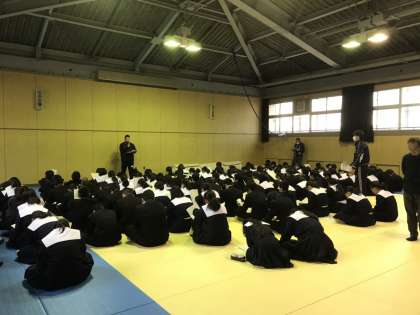 明日の高校見学についての事前指導を体育ホールで行いました。