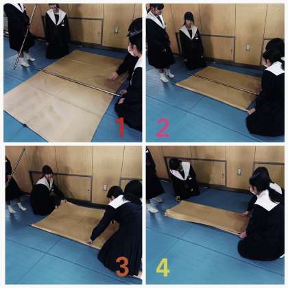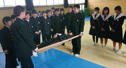 けが人を運ぶためのタンカーを、毛布と物干し竿で代用する方法を学びました。