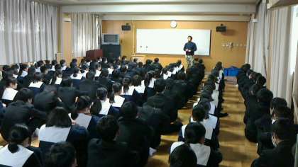 本日、3年生は6時間目に多目的室に集まり、明日に控えた私立高校受験に際しての諸注意を聞きました。