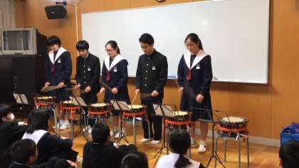 本日、学年集会では音楽の授業で行われた和太鼓発表会の各クラスの最優秀賞班が演奏を行いました。