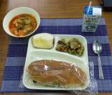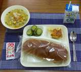 本日の献立 ツナポテトオムレツ(ケチャップ付き) スープ(豚肉、にんじん...