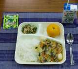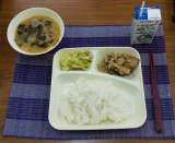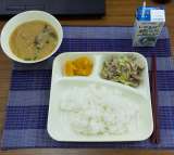 本日の献立 豚肉のカレー風味焼き(豚肉、ピーマン) ケチャップ煮(鶏肉、...