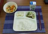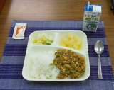 本日の献立 大豆入りキーマカレーライス…牛ひき肉、豚ひき肉、大豆、玉ねぎ、にん...
