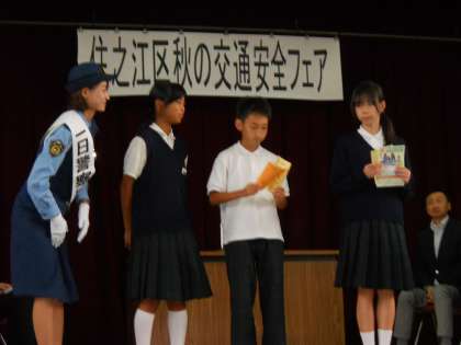 9月20日(土)に行われた「住之江区交通安全フェア」に生徒会の代表が参加しました。区内7中学校の代表が「自転車マナーアップ宣言」をした後、スケアード・ストレート方式による交通事故の再現を見学しました。時速40キロで走行する車が自転車に乗ったマネキンを跳ね飛ばすシーンをはじめ、スタントマンが再現する様子はすごい迫力で、事故の恐ろしさを痛感しました。