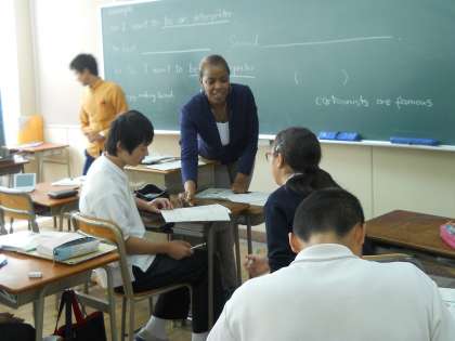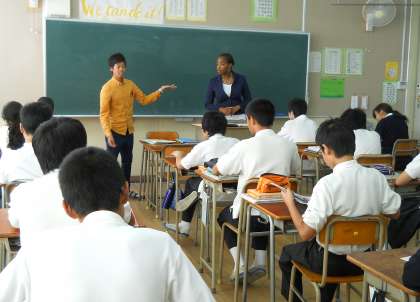 今日は2年生がスー先生との授業です。初めは少しシャイな生徒たちですが授業が進むにつれて声も大きくなり、I want to be a △○□.