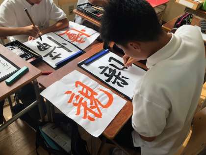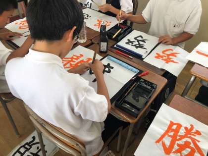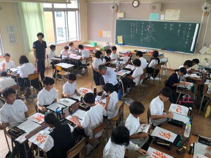 本日、1時間目に1−3、2時間目に1−1、3時間目に1−2で書写出前授業が行われました。南港桜小学校の教頭先生が授業をしてくださり、子供たちは「友達に送る一文字」を書きあげました。
