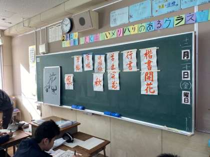 2年生の国語で筆ペンを用いて行書で自分の名前を書いてみました。元気アップの方々をゲストティーチャーとしてお招きし、丁寧に教えていただきました。