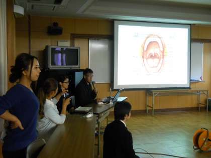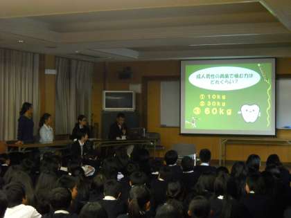 11月10日(月)6限、歯科校医の柳田先生に来ていただき、1年生対象に「歯と口の健康教室」を行いました。スライドを使い「むし歯」のできる理由や歯磨きの大切さなどをわかりやすく教えていただきました。リアルな写真には思わず悲鳴もあがるほどで、まだ治療していない人にはいい機会になったと思います。「8020」めざしてしっかり歯磨きしよう!