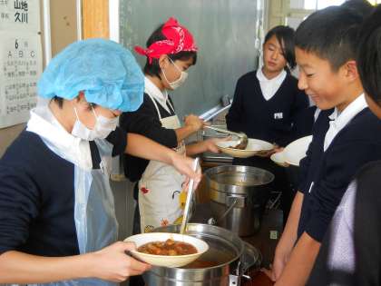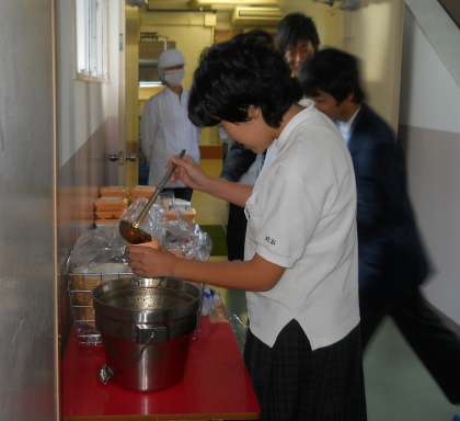今日の給食の主菜は「かるしおメニュー」を参考にしたビーフシチューです。全員喫食の1年生は教室で当番が、選択給食の学年は配膳室前で自分で取り分けます。生徒たちからは「給食、おいしくなってきたね。」との声もあり、みんなで楽しくいただきました。