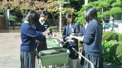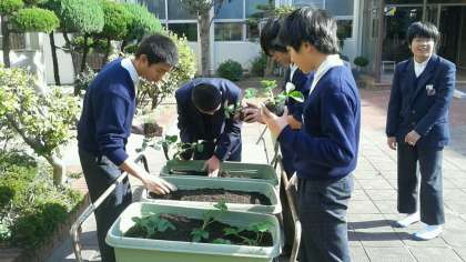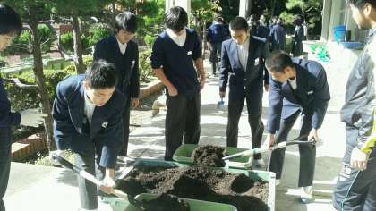 13日(木)2年生の技術の授業で恒例のいちごの苗植えをしました。陽射しはありましたが冷たい風の中、プランターに土を入れ一人一株ずつていねいに植え付けていきました。虫がでてきて悲鳴を上げる女子もいましたが、土や苗に触れてみんないい顔をしていました。来春の収穫が楽しみです。