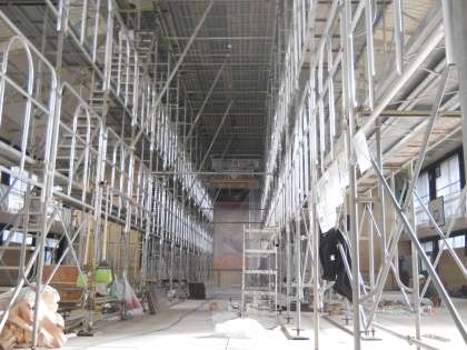 先月から始まった体育館改修工事が順調に進んでます。足場を組み吊り天井を外して、LED照明も取り付けました。