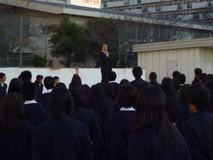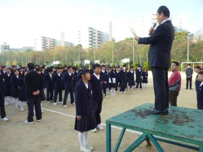 冬空の寒さの中、みんなしっかりと整列し、校長先生のお話を聞いていました。