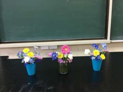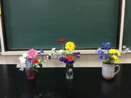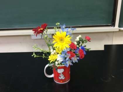 華道部の作品です。カラフルなお花の可愛い作品ですね!!いつもとは一風変わった作品ですね。次の作品も期待しています!!