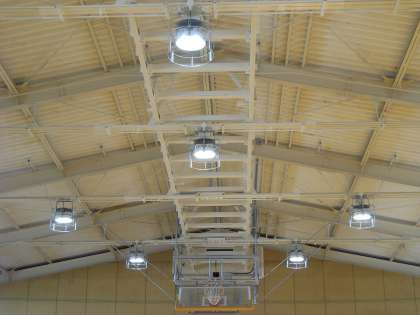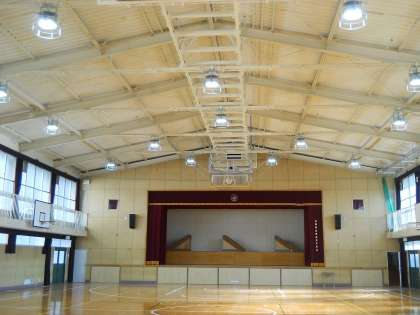 11月から行っていた体育館改修工事が完成しました。地震等による天井の落下防止対策のために中央部の天井ボードと照明を撤去し、光量調節のできるLED照明に交換しました。以前よりかなり明るくなり、使いやすくなりました。明日の始業式から早速使用します。