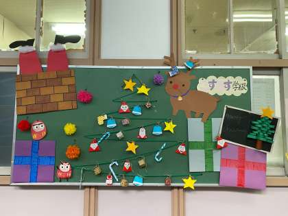 こすもす学級前の掲示板をクリスマス仕様にするために、生徒と一緒に作成しました!