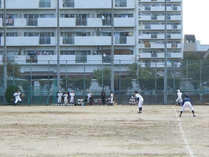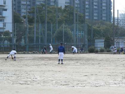 体育館でバレーボール部の大会が行われた8日(日)、運動場では野球部が練習試合を行っていました。人数が少ないため我孫子南中との連合チームで住之江中と対戦し、第1試合は0−3、第2試合は2−2の結果でした。15日(土)には大阪市春季大会一回戦に臨みます。健闘を期待しています。