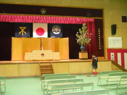 あいにくの天気になりましたが、午後から入学式の会場準備を行いました。2・3年生の係の生徒が心をこめて立派な式場を作ってくれました。校庭の桜も満開で、明日の入学式が楽しみです。