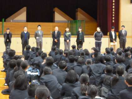 着任式では、新しく着任された先生の紹介と学級担任の紹介がありました。担任が発表されると生徒たちの中から歓声があがっていました。