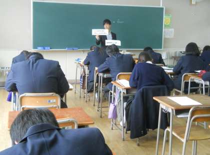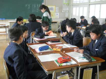写真左、3年3組の英語です。フラッシュカードを使って単語の練習。しっかり覚えよう。
