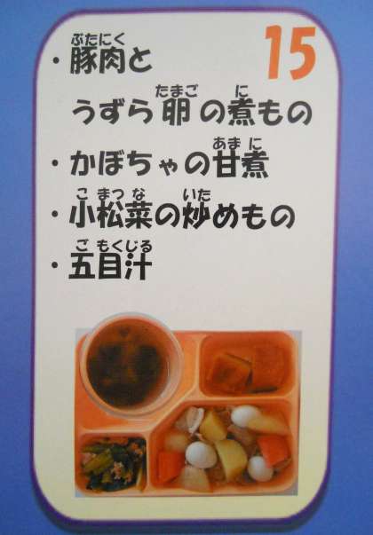 今日の給食の汁物は「五目汁」です。鶏肉、うすあげ、たまねぎ、しめじ、みつばと具だくさんで、おいしくいただきました。