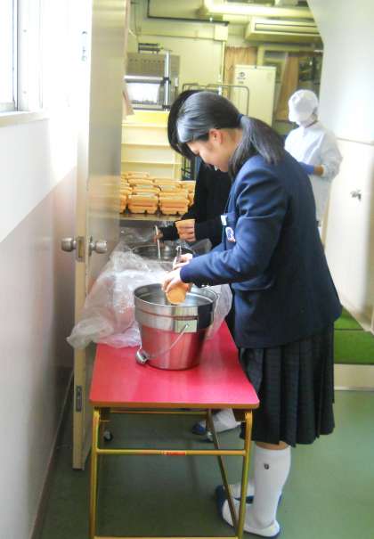 選択制の3年生は、配膳室前で一人ひとり器によそいます。