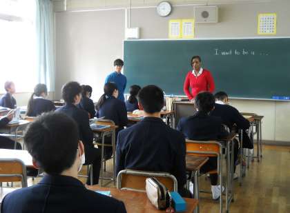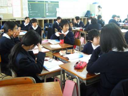 写真左は3年1組の英語の授業。C−NETの先生とのティームティチングの様子です。スー先生は3年目。3年生とはすっかり顔なじみで、フレンドリーな授業が展開されます。I want to be a・・・.ちなみに、スー先生はジャマイカで小学校の校長先生になりたいそうです。