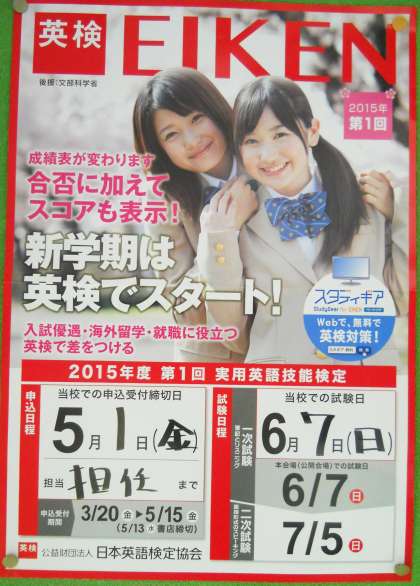 「英語検定」は2月に1年生全員が受験しますが、元気アップでは年3回学校会場で実施します。(3級の2次は別会場)3〜5級まで受験できますので、年3回の機会をうまく利用してください。