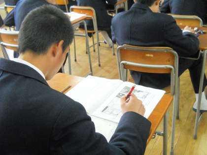 1限目から、国語A・B問題、数学A・B問題、理科、生徒質問紙調査を行います。今年度から大阪府の公立入学者選抜の評定の基準に使われることもあり、生徒たちは例年以上に真剣に取り組んでいるようでした。