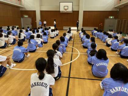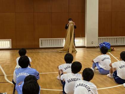 生徒代表からの挨拶のあと、少年自然の家のスタッフさんから、救命道具や寝具の使い方の説明がありました。