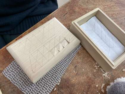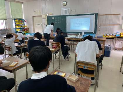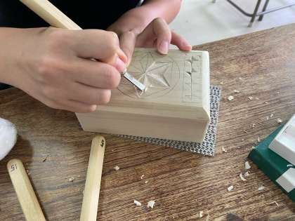 現在は彫刻の2回目で、3年1組の生徒は自分で考えたデザインを箱に転写し、デザイン通りに掘っていました。