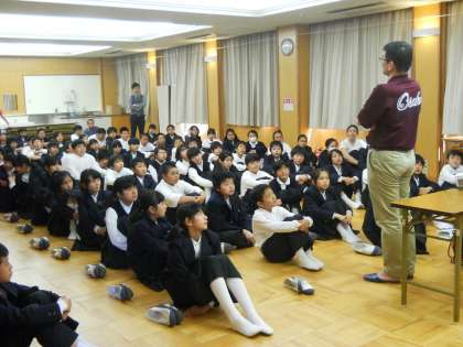 5限、1年生は多目的室で一泊移住のオリエンテーションを行いました。