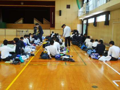 11日(月)からの修学旅行に備えて3年生の事前指導を行いました。荷物の点検や集合隊形や活動班の確認など準備はばっちりです。当日、新大阪駅の集合時間に怒れないように!