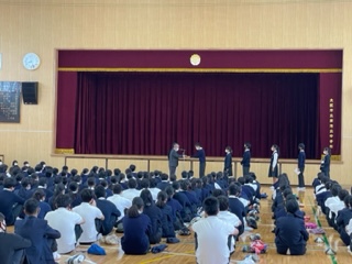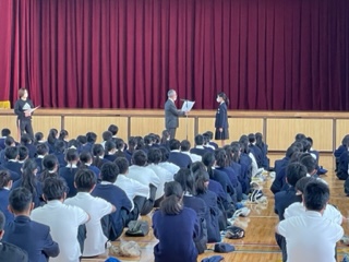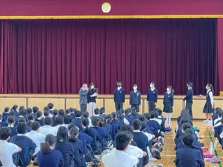 木曜日ですが、全校集会を実施しました。おさかなコンクール、英語検定、後期学級委員認証式の表彰がありました。新型コロナウィルス感染症で後期学級委員の時期が少し短くなりましたが、委員としての自覚と責任をもち、行動しましょう。