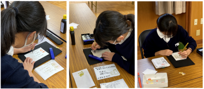 放課後に、書道教室が行われました。今回は、以前から取り組んでいた、年賀状の仕上げを行いました。何度も何度も練習し、緊張しながら年賀はがきに書き込みました。心を込めて書いた年賀状。きっと喜んでくれると思います!