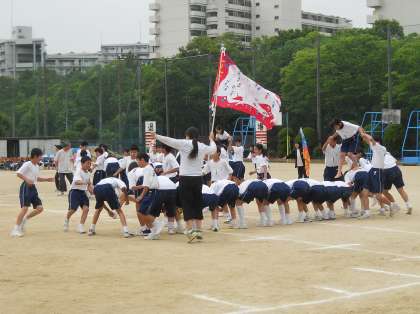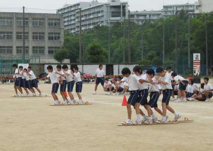 写真上、2年生の「ムカデリレー」簡単そうでもなかなか難しい。