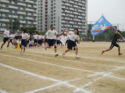 下、3年生の「全員リレー」リレーといっても単純に走るだけではな