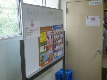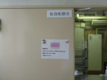 給食の配膳室です。昼休みに子供たちが個々取りに来ます。全員喫食制になりましたら、小学校のように給食係が取りに行くことになります。