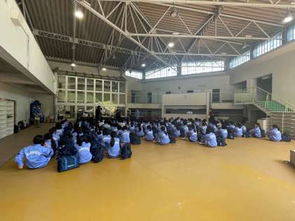 入所式でこれからお世話になる施設の方へのあいさつのあと、施設利用の説明をうけています。