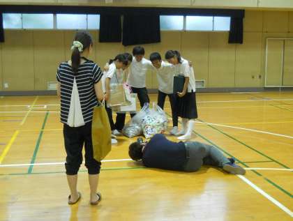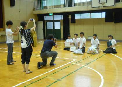 雨のため体育館での撮影となりましたが、生徒会の5人がエコキャップ・リングタブ回収や目安箱といった普段の活動の様子を紹介。最高の笑顔を見せてくれました。