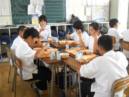 教育実習生も給食体験。生徒と一緒にいただきます。
