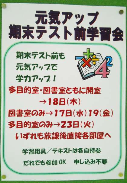 元気アップ学習会も毎日開催しますので、一人では勉強しにくいな、と感じている人はぜひ参加を。