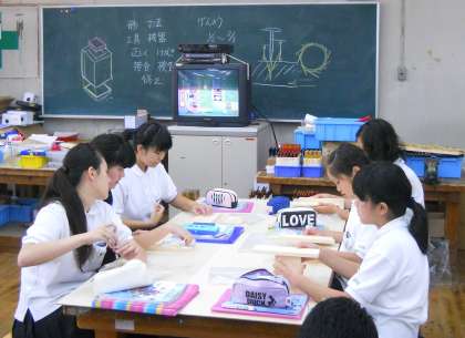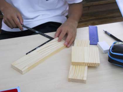 3・4限目、1年2組の技術の授業です。木材加工の単元でペンスタンドなどを作ります。今日は材料にけがき線を入れるとこくらいまでかな?