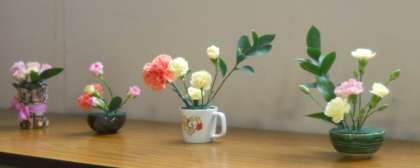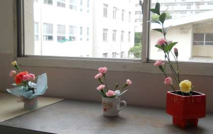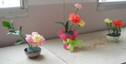 今回の華道部の作品は、カーネーションとミニばら。いつもながら同じ材料でも一人一人の感性のちがいがよく出ています。