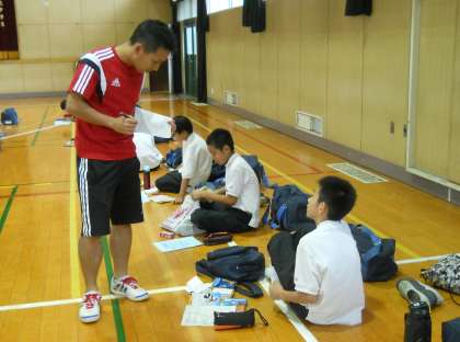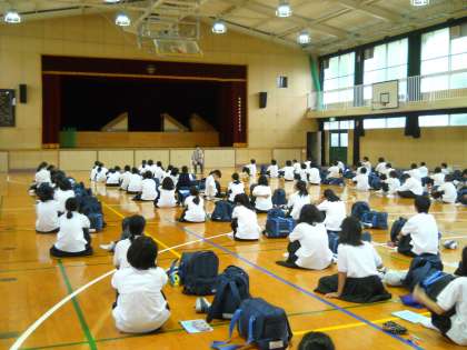 3.4限目、1年生は体育館で明日からの一泊移住の事前指導。